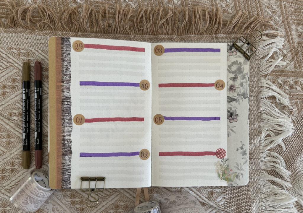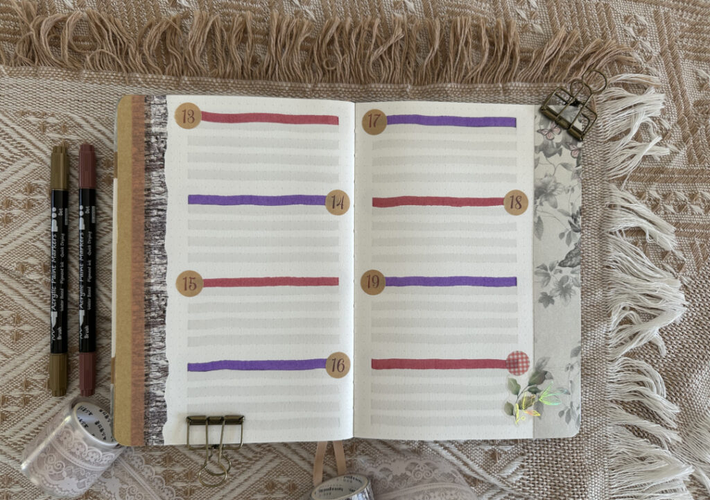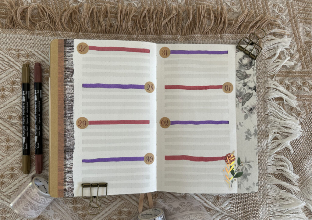 I alternated hand drawn, messy headers for each day, capped off with printed numbers that I then punched out with a circular paper punch I recently bought. I did enjoy having an extra space to write down some tasks to focus on last month, so I’m going to keep including that in my weekly spreads, creating a comfortable even number of eight areas in the process.