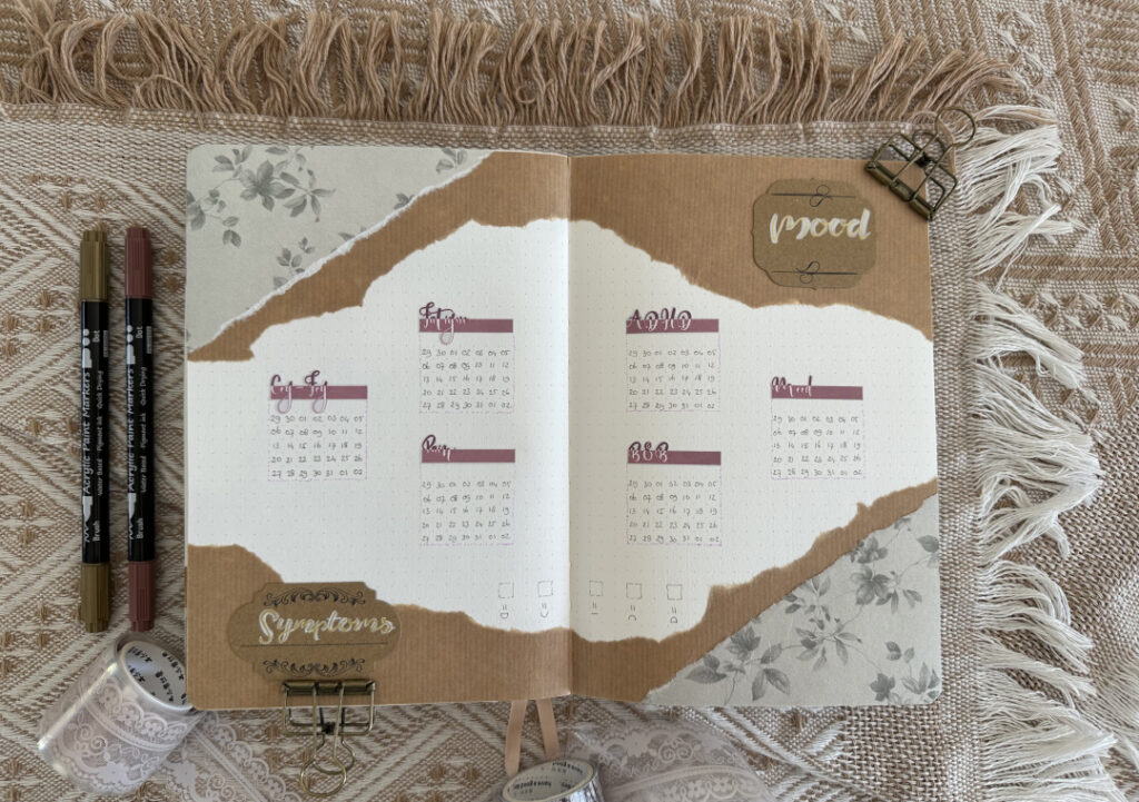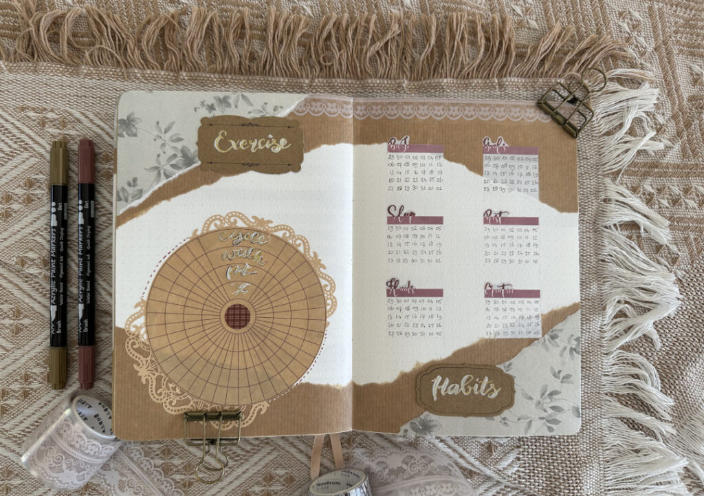 I adore how this spread came out. I printed the circular exercise tracker on sticky craftpaper and added a decorative frame cut in two behind it for added visual interest. The habit trackers are a mix of handwritten numbers and duo tone headers.